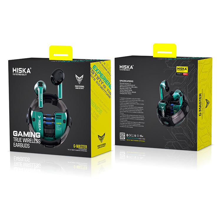 ندزفری و ایرپاد گیمینگ بلوتوثی بیسیم هیسکا مدل G-MASTER به دلیل طراحی خوب، متریال با دوام و کیفیت صدای فوق العادهای که دارد یکی از بهترین های هندزفری های گیمینگ بلوتوثی موجود در بازار است. این هندزفری ایرپاد گیمینگ بیسیم TWS با داشتن کیس شارژ خاص و بسیار جذاب و نورپردازی RGB، یکی از جذاب ترین انتخاب ها برای گیمینگ و استفاده روزمره حساب می شود. طراحی کیس این ایرپاد گیمینگ هیسکا بسیار متفاوت است. این کیس شارژ دارای قابلیت چرخش میباشد. این ایرپاد و هندزفری گیمینگ حرفهای با داشتن طراحی منحصربفرد، تکنولوژی صدای Hi-Fi، قابلیت کاهش نویز های محیطی و فلزی بودن بدنه خود، یکی از حرفهای ترین و زیباترین هندزفری های گیمینگ امسال به شمار میآید. هندزفری بلوتوثی هیسکا مدل G-MASTER ، شارژدهی بسیار عالی دارد که در حالت فول شارژ حدودا 3 ساعت و 30 دقیقه به موسیقی گوش بدهید و یا مکالمه کنید (ولوم حدود 70٪). باتری موجود در کیس شارژ این هندزفری بیسیم 300 میلی آمپر ساعتی و باتری ایربادزها 30 میلی آمپر ساعتی است. مدت زمان تقریبی فول شارژ شدن این هندزفری گیمینگ 90 دقیقه میباشد. این هندزفری گیمینگ بلوتوثی با کمک یک پورت USB-C شارژ میشود. همچنین سیگنال این ایرپاد بیسیم گیمینگ پایدار بوده و برد تقریبی 10 متر دارد.