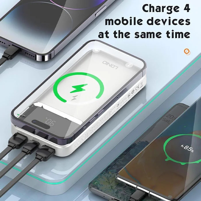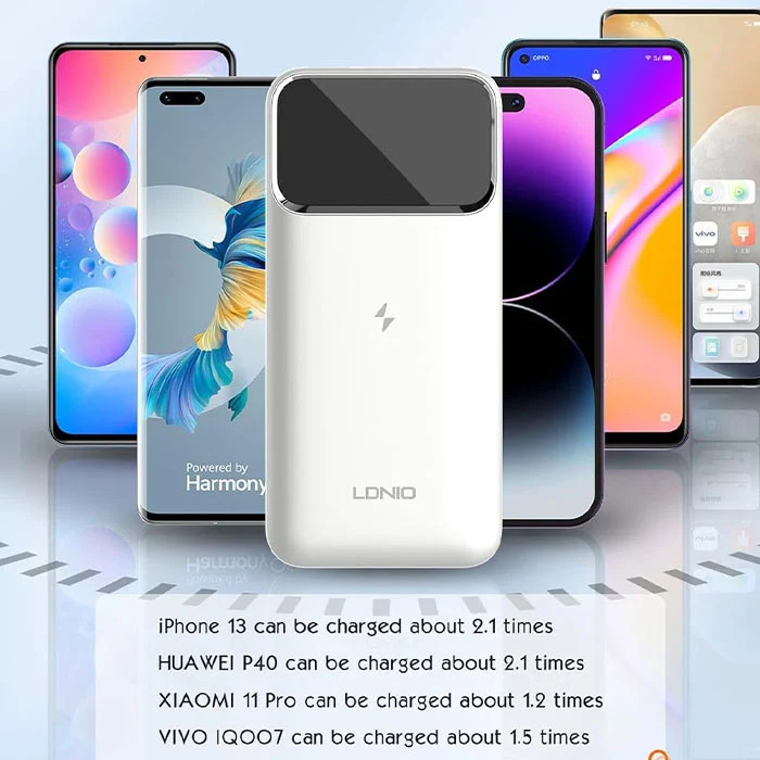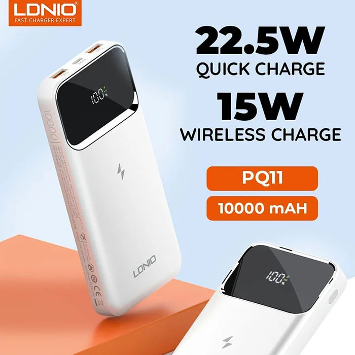 پاوربانک LDNIO PQIZ با پورتهای مختلفی که دارد و قابلیت شارژ وایرلس مگنتی، امکانات خوبی را برای کاربران فراهم کرده است؛ از سری آیفون 12 به بعد گوشیهای اپل میتواند به کمک قابلیت مغناطیسی بدنهاش به شارژرهای وایرلسی که مغناطیسی هستند بچسبد و سریع شارژ شود. در حالی که سایر گوشی های دارای قابلیت وایرلس خاصیت مگنتی ندارند و همیشه احتمال جدا شدن از شارژر وجود دارد. ر روی بدنه ی این شارژر قسمتی برای شارژ وایرلس در نظر گرفته شده که شما با استفاده از آن می توانید گوشی های خود که از این تکنولوژی پشتیبانی می کنند را شارژ کنید. این قسمت مگنتی بوده که باعث می شود گوشی و شارژر در دقیق ترین حالت روی هم قرار گرفته و شارژ به نحو احسن انجام شود. البته گوشی شما باید از این قابلیت نیز (مگنتی) پشتیبانی کند. قابلیت استفاده در هواپیما در بیشتر موارد حمل و استفاده از پاوربانک در هواپیما ممنوع است؛ اما بعضی از پاوربانک ها اجازه ورود به هوایپما را دارند. یکی از ویژگی های مهم پاوربانک LDNIO PQ10 قابلیت حمل و استفاده در هواپیما است. تکنولوژی شارژ سریع PD و QC پاوربانک وایرلس مگنتی الدینیو PQIZ از تکنولوژی شارژ سریع PD و QC در پورت USB و Type C پشتیبانی می کند؛ و شما می توانید با استفاده از این درگاه ها دستگاه های (یک یا چند دستگاه) خود را با سرعت بالا شارژ کنید. باید توجه داشته باشید که در هنگام شارژ همزمان چندین دستگاه توان خروجی این پاوربانک بین پورت ها تقسیم خواهد شد. حداکثر توان پورت PD برابر با 20 وات خواهد بود. باید توجه داشته باشید که ظرفیتی که از پاوربانک دریافت میکنید دقیقا همان ظرفیتی که روی آن درج شده نخواهد بود. ظرفیت نوشته شده روی پاوربانک ظرفیت اسمی نام دارد. ظرفیت اسمی پاوربانکها با ولتاژ 3.7 ولت محاسبه میشود اما ظرفیتی که شما دریافت میکنید با ولتاژ مناسب دستگاهی است که آن را با پاوربانک شارژ میکنید. عواملی چون هدر رفت ظرفیت طی فرآیند تبدیل ولتاژ، استفاده از کابل نامناسب، استفاده از گوشی در حین شارژ توسط پاوربانک، باز بودن برنامههای زیاد در پس زمینه گوشی و ... میتوانند در از دست رفتن ظرفیت پاوربانک تاثیر گذار باشند. ظرفیت واقعی این پاوربانک 10000 میلی آمپر بسته به ولتاژ خروجی دستگاههای شما حدودا در رنج 5 تا 7 هزار میلی آمپر خواهد بود.